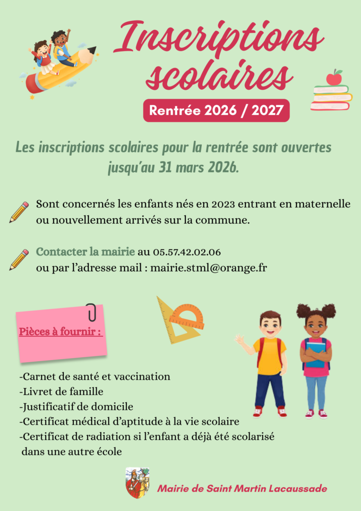 INSCRIPTIONS SCOLAIRESA la une9 mars 2026 https://saintmartinlacaussade.fr/wp-content/uploads/2026/03/Inscriptions-scolaires-6.png 2000 1414 Equipe Mairie https://saintmartinlacaussade.fr/wp-content/uploads/2019/09/logo-saintmartin-lacaussade.png Equipe Mairie2026-03-09 16:55:332026-03-09 16:55:34INSCRIPTIONS SCOLAIRES