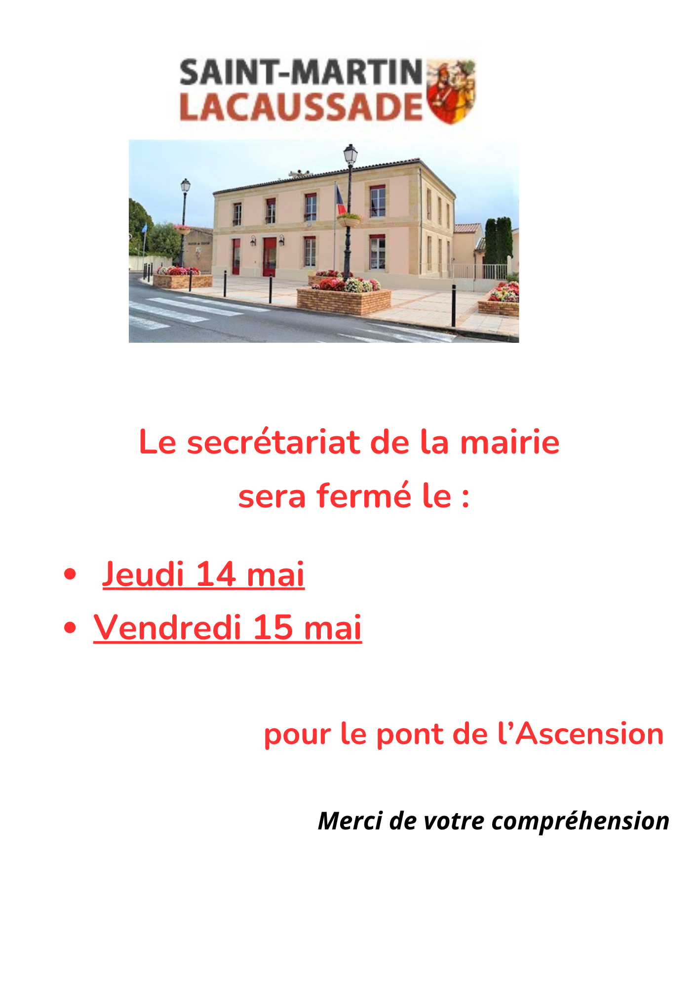 SECRETARIAT FERMEA la une20 avril 2026 https://saintmartinlacaussade.fr/wp-content/uploads/2026/04/La-Mairie-sera-fermee-ce-Mardi-20-Fevrier-2024-de-14h00-a-17h00-1.png 2000 1414 Equipe Mairie https://saintmartinlacaussade.fr/wp-content/uploads/2019/09/logo-saintmartin-lacaussade.png Equipe Mairie2026-04-20 11:14:502026-04-20 11:14:51SECRETARIAT FERME