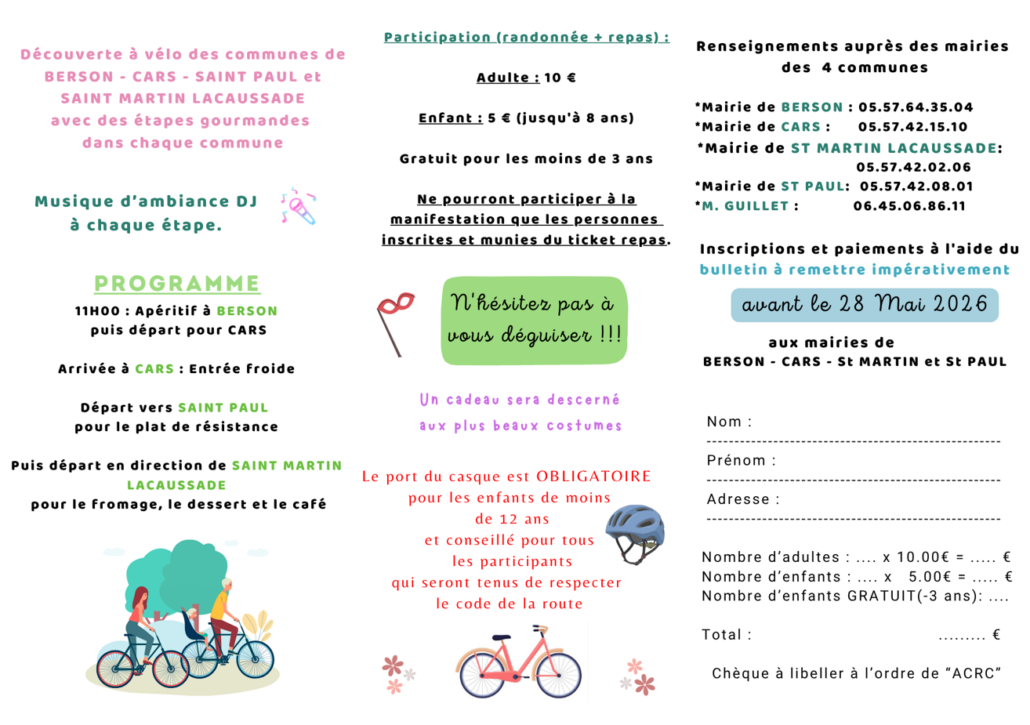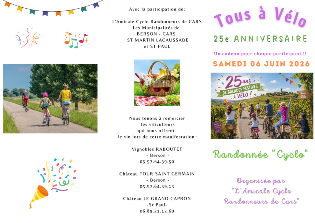 Organisée par l’Amicale Cyclo Randonneurs de Cars, avec le précieux soutien des bénévoles des quatre communes étapes — Berson, Cars, Saint-Paul et Saint-Martin-Lacaussade — cette journée promet d’être placée sous le signe du partage et de la bonne humeur.